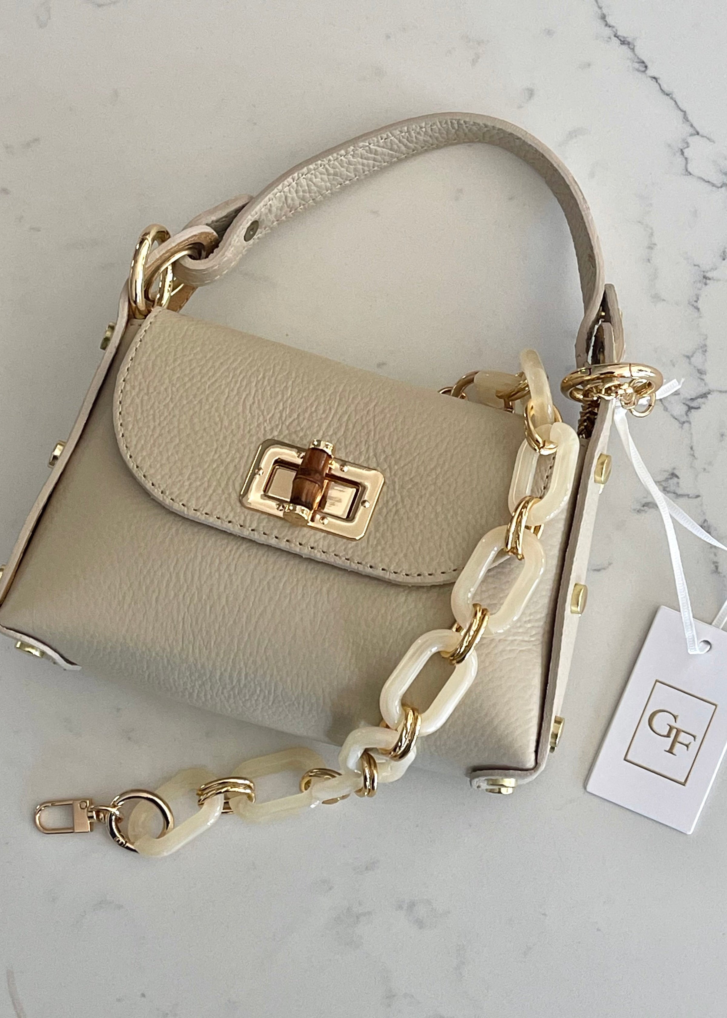 Stylish designer made from premium Italian leather. It features a bamboo locking clasp on the front that sets it apart. Inside, you'll find a spacious main compartment secured with a zip closure, along with a long shoulder chain for effortless carrying.