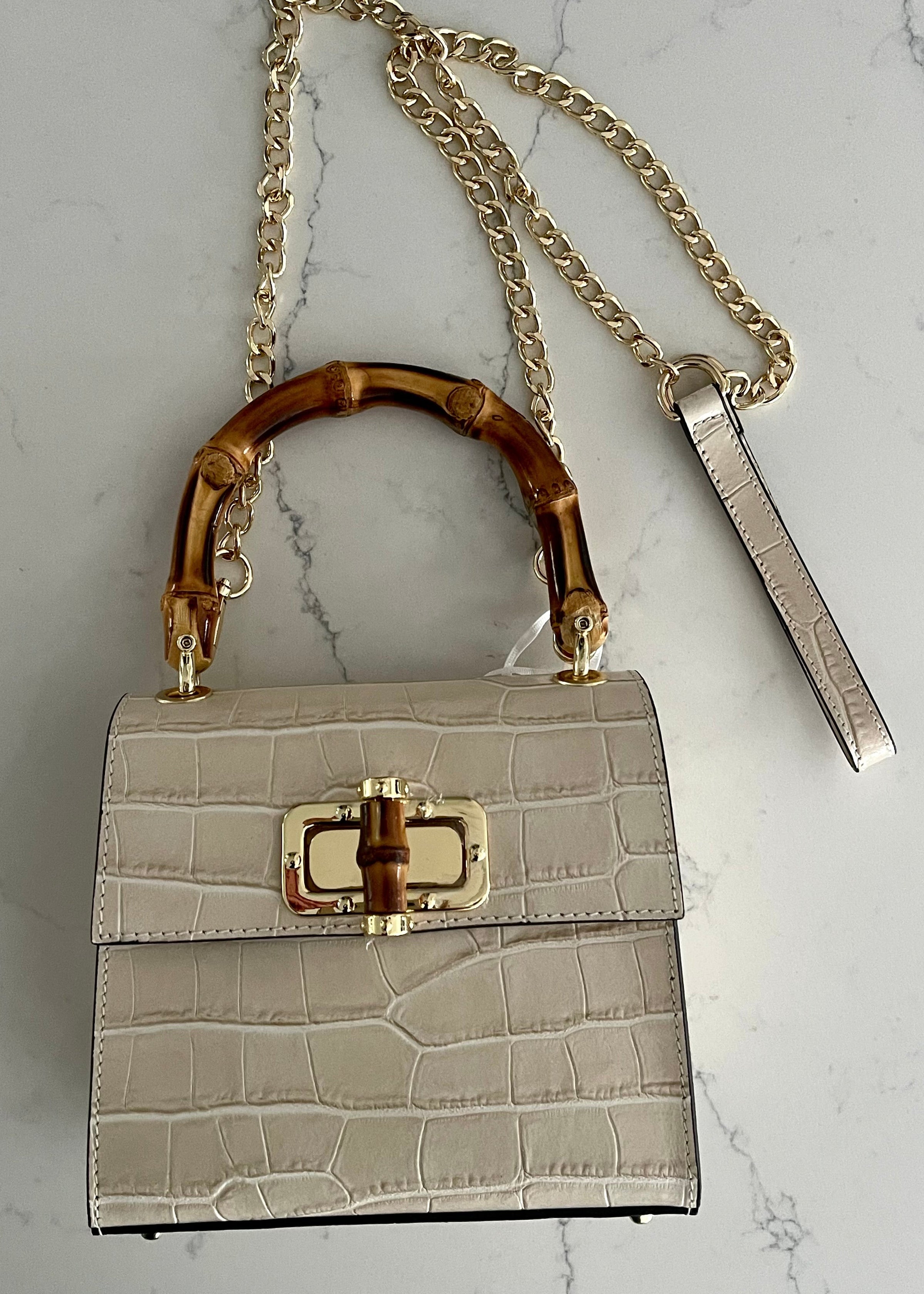 Genuine Italian leather purse with bamboo handle and gold chain strap