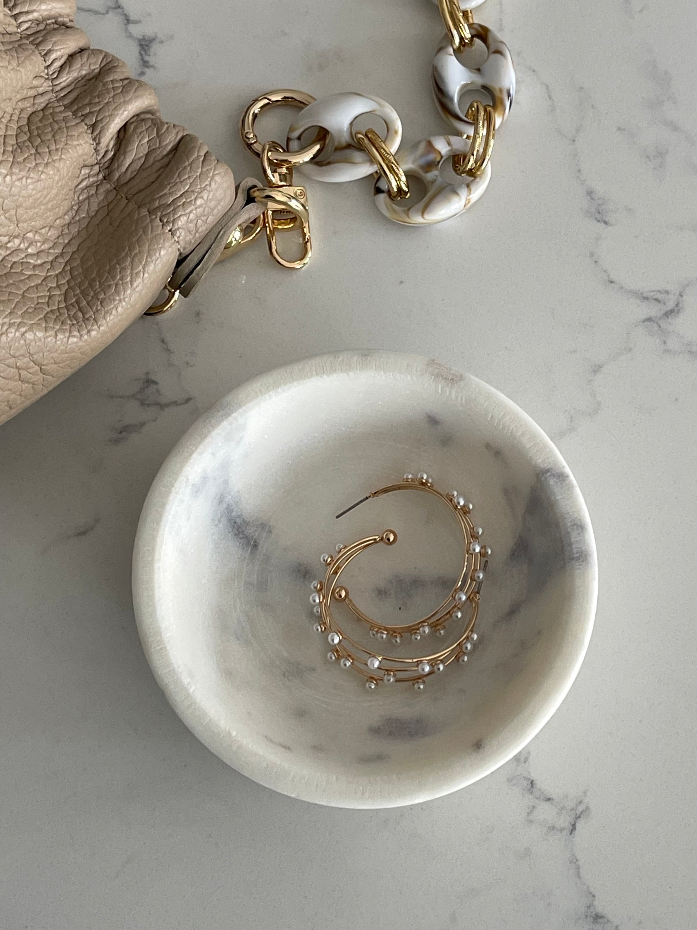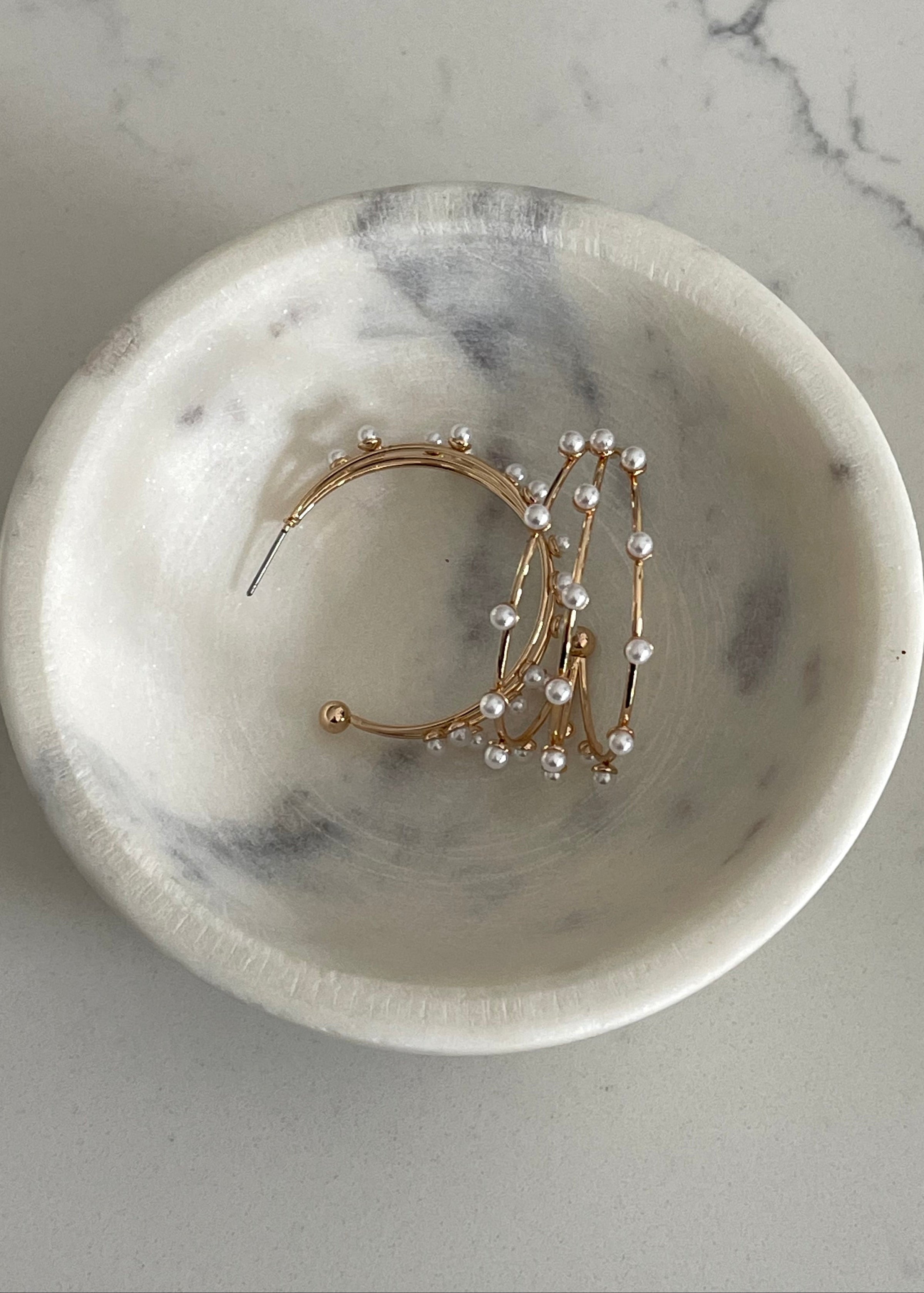 A stylish and elegant pair of earrings that combines the classic beauty of pearls with a modern triple row design. These earrings are meticulously crafted to ensure durability, shine, and comfort during wear. Product Details: Length: 1.25" Width: 1.25" Earring back: Post Metal finish: gold, rhodium Plated Product: Lead & Nickel Compliant Anti-tarnish: Double E-coating