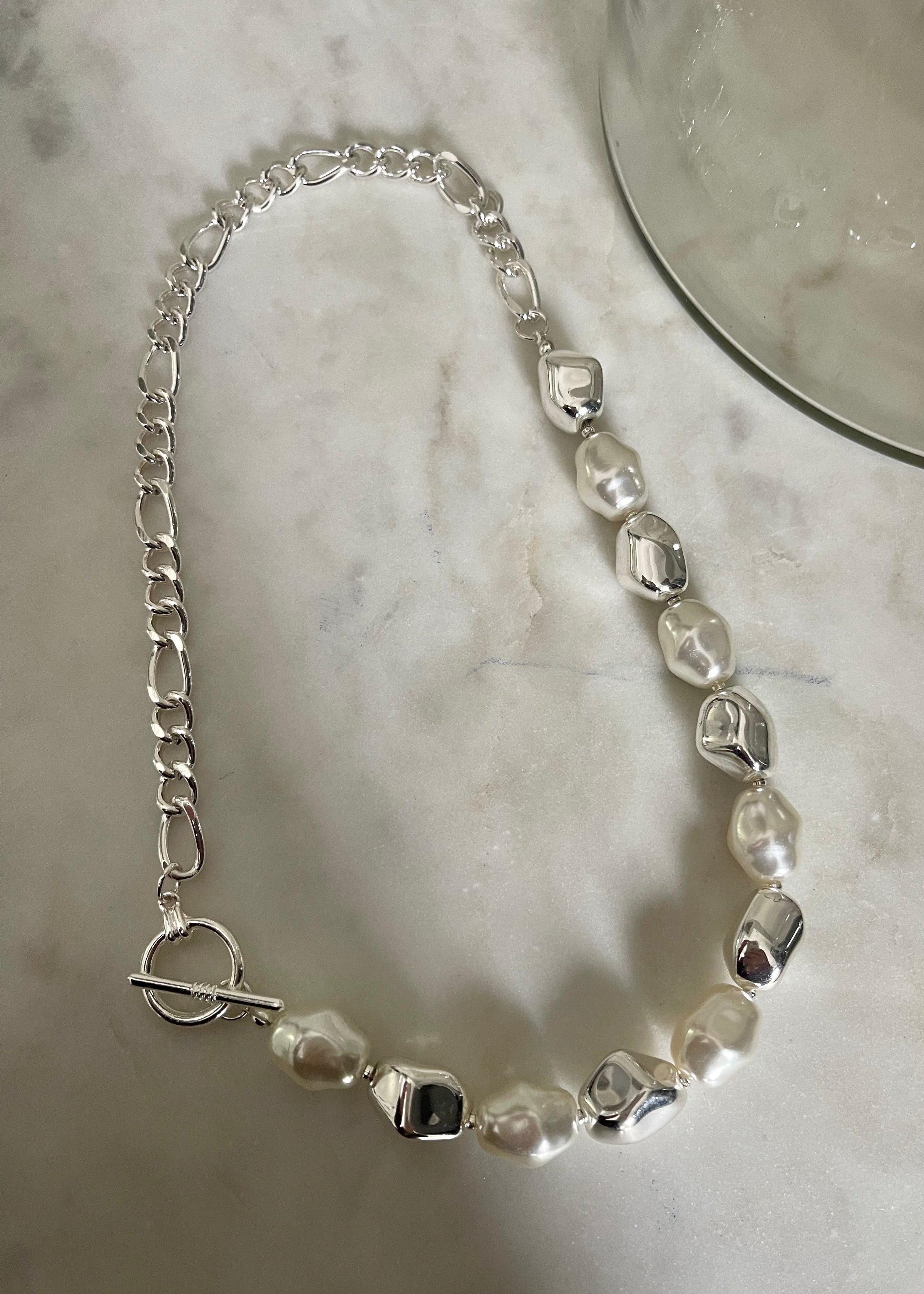 Add modern elegance to your look with this Pearl Metal Bead Chain Toggle Clasp Necklace. Featuring a chic mix of lustrous pearls and polished gold-tone beads with a trendy toggle clasp, this necklace blends classic charm with contemporary style. Perfect for layering or wearing solo, it's a versatile accessory for both everyday wear and special occasions. Necklace Length : 19" Pearl Toggle Necklace | Metal Bead Chain Necklace | Elegant Pearl Jewelry | Gold Bead Statement Necklace | Modern Toggle Clasp Necklace | Chic Layering Necklace | Fashion Forward Pearl Accessories | Sophisticated Women's Jewelry | Stylish Everyday Necklace | Contemporary Pearl Bead Necklace | Luxury Toggle Clasp Jewelry | Timeless Pearl and Gold Necklace |