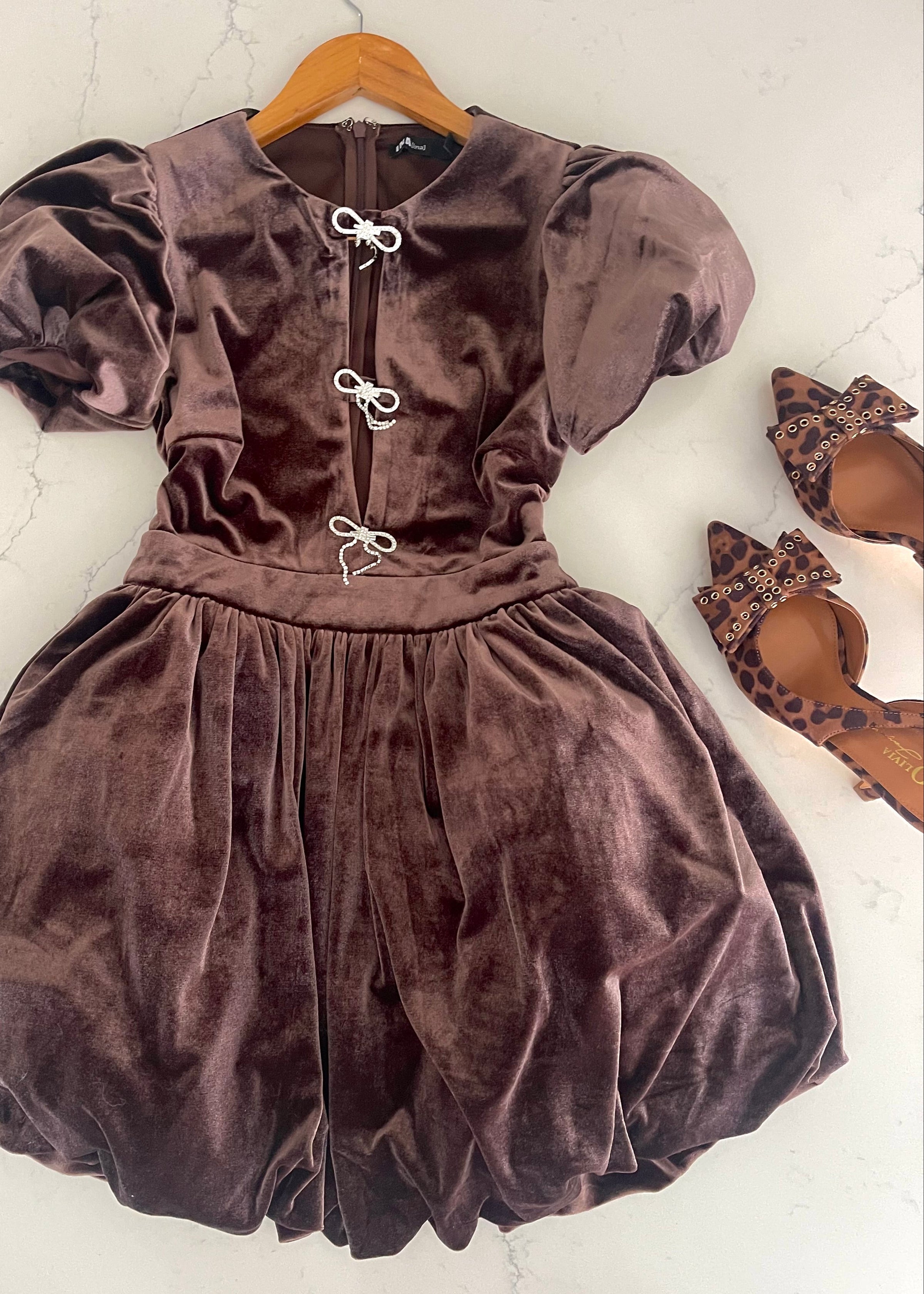 Velvet Puff-Sleeve Bow Bubble Hem Mini Dress -Luxurious velvet mini dress with a soft sheen finish -Crystal bow accents highlight the keyhole front detail -Puff sleeves add volume and a romantic silhouette -Bubble hem skirt creates playful yet elegant movement -Hidden back zipper ensures a smooth fit -Perfect for holiday parties, evening events