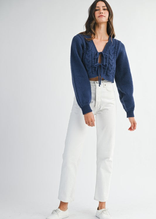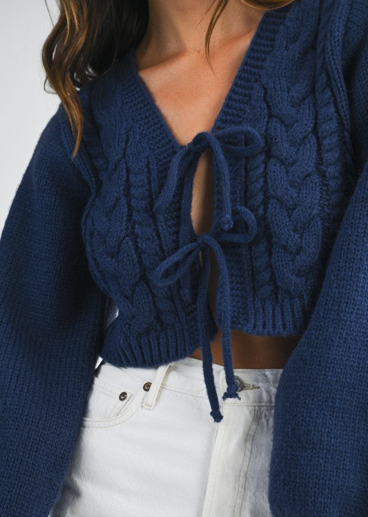 Cable Knit Front Self Tie Bow Crop Cardigan