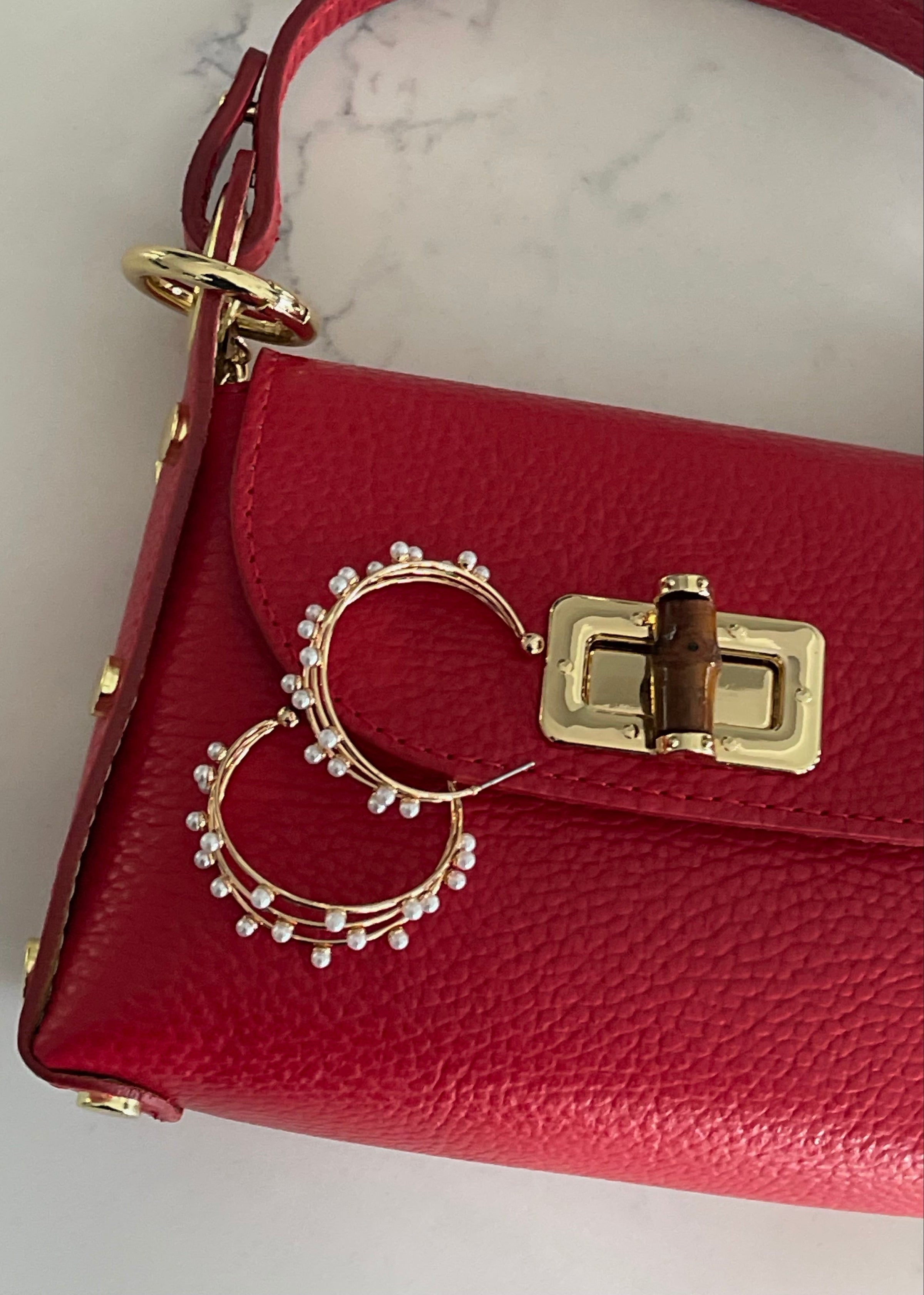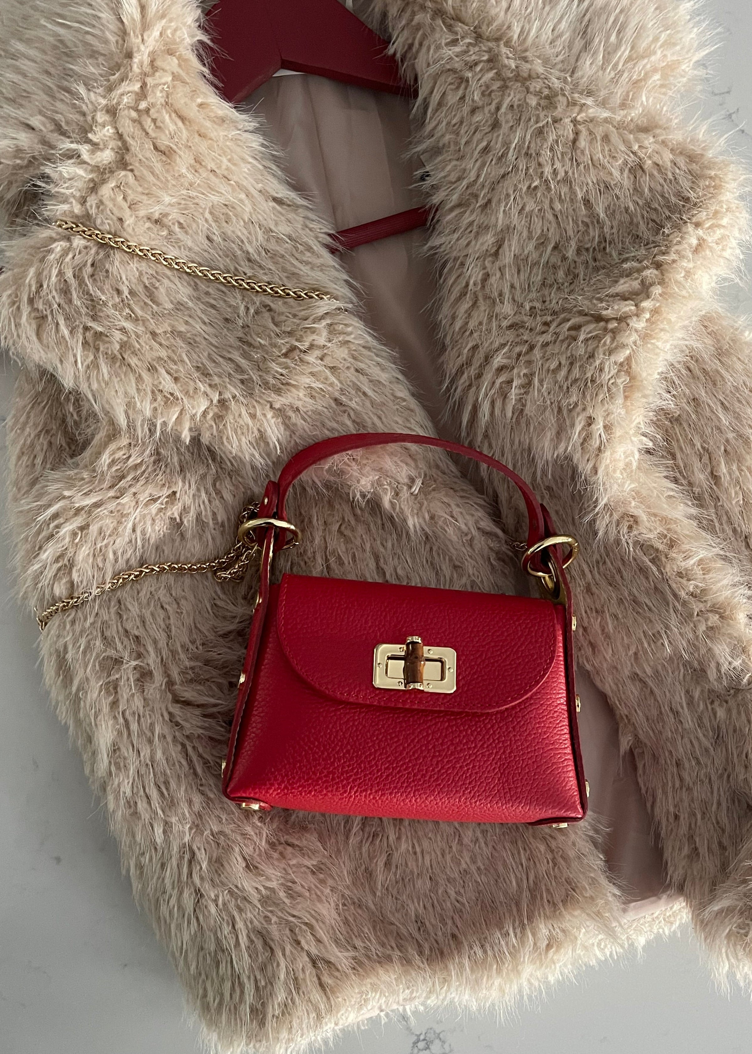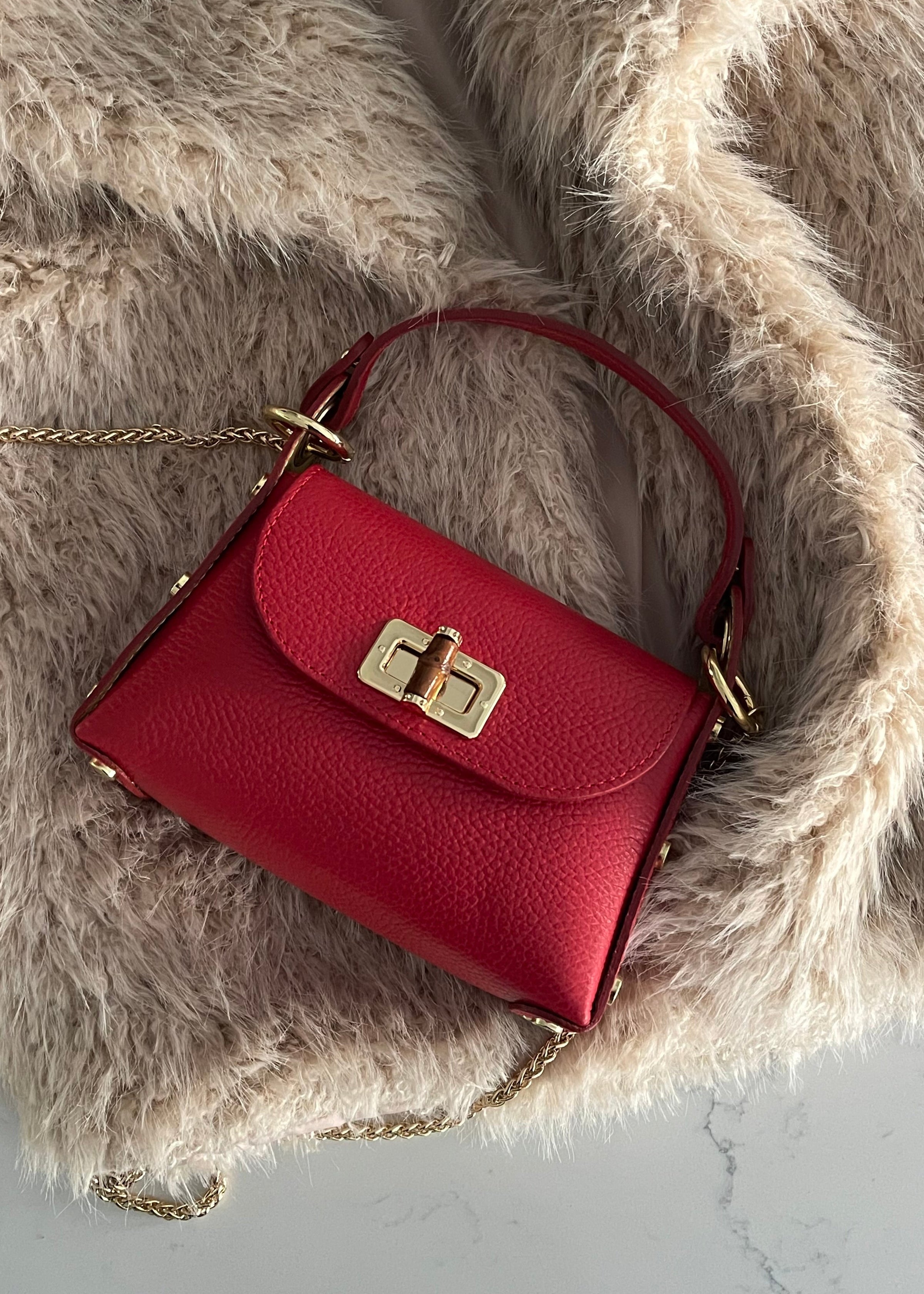stylish designer made from premium Italian leather. It features a bamboo locking clasp on the front that sets it apart. Inside, you'll find a spacious main compartment secured with a zip closure, along with a long shoulder chain for effortless carrying.