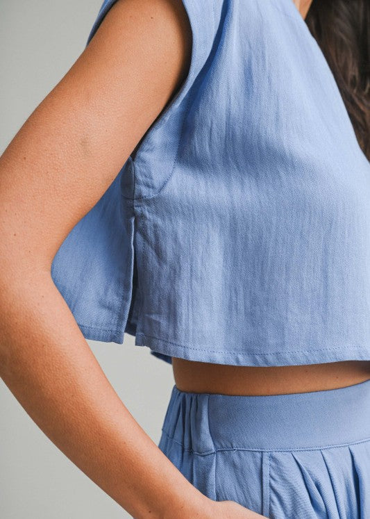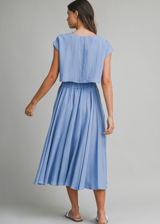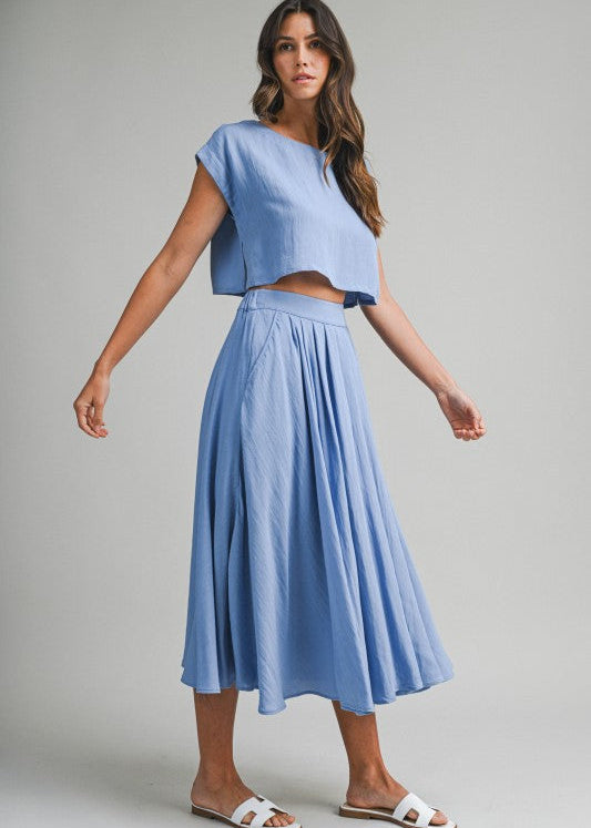 Linen like crop top and midi flare skirt with side pocket set. Lining French Blue
