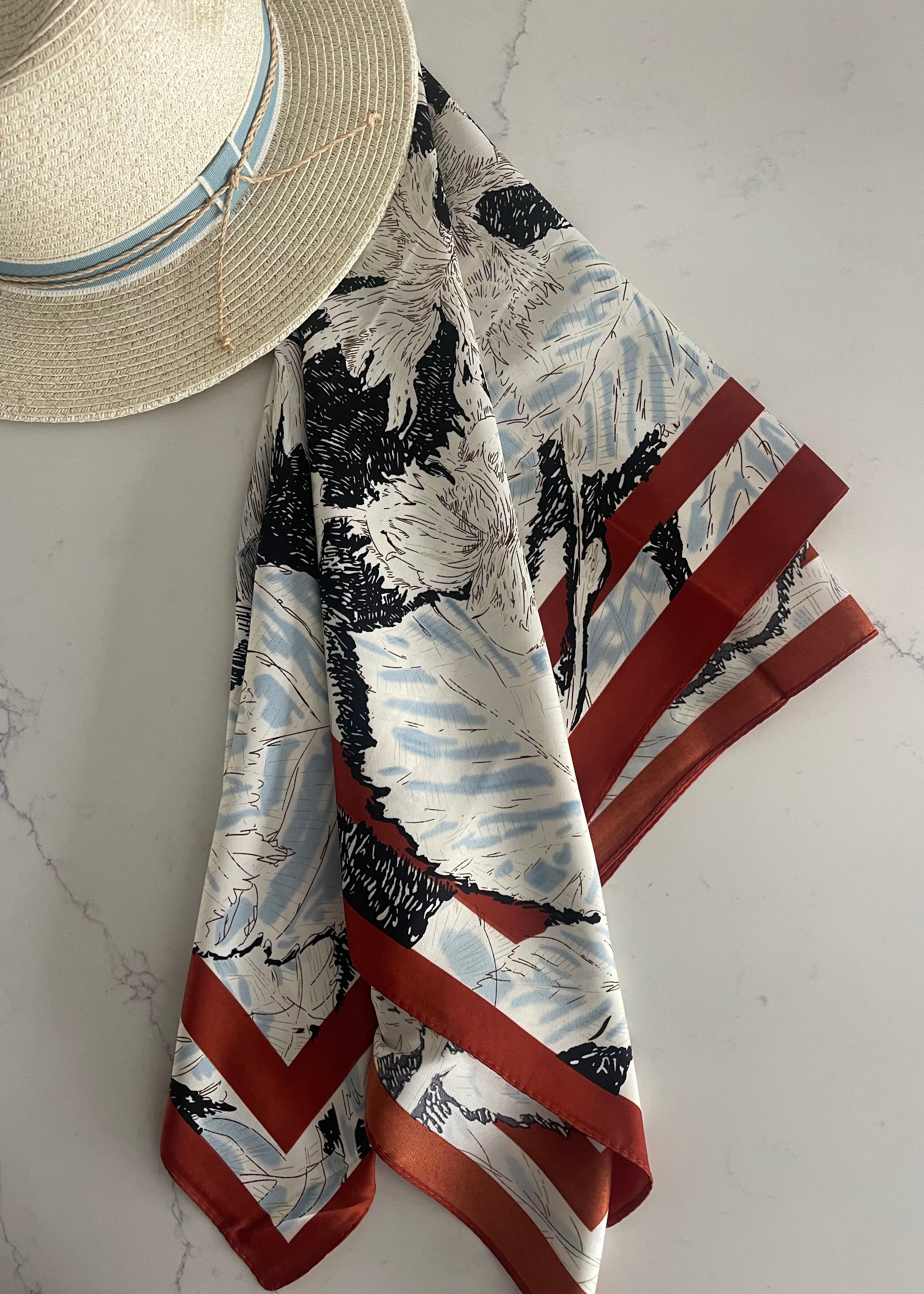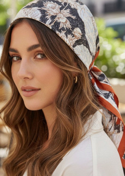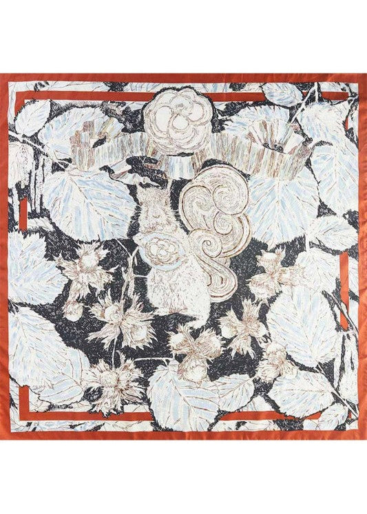 Elevate your look with this whimsical square scarf featuring a playful squirrel surrounded by lush foliage artwork. Designed with a detailed nature illustration framed in an elegant border, this versatile accessory adds charm whether styled around the neck, hair, or bag. A unique gift for animal lovers and a standout piece for everyday outfits. Whimsical Squirrel Foliage Printed Square Silky Satin Bandana Scarf