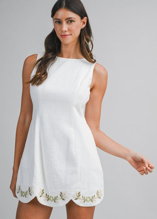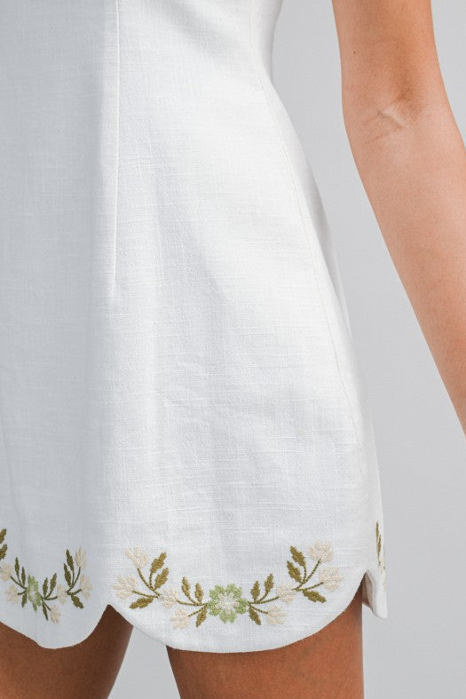 Linen mix sleeveless mini dress with side pocket detail. Finished with a scalloped hem detailed with floral embroidery along the edge. Back invisible zipper. Lining.