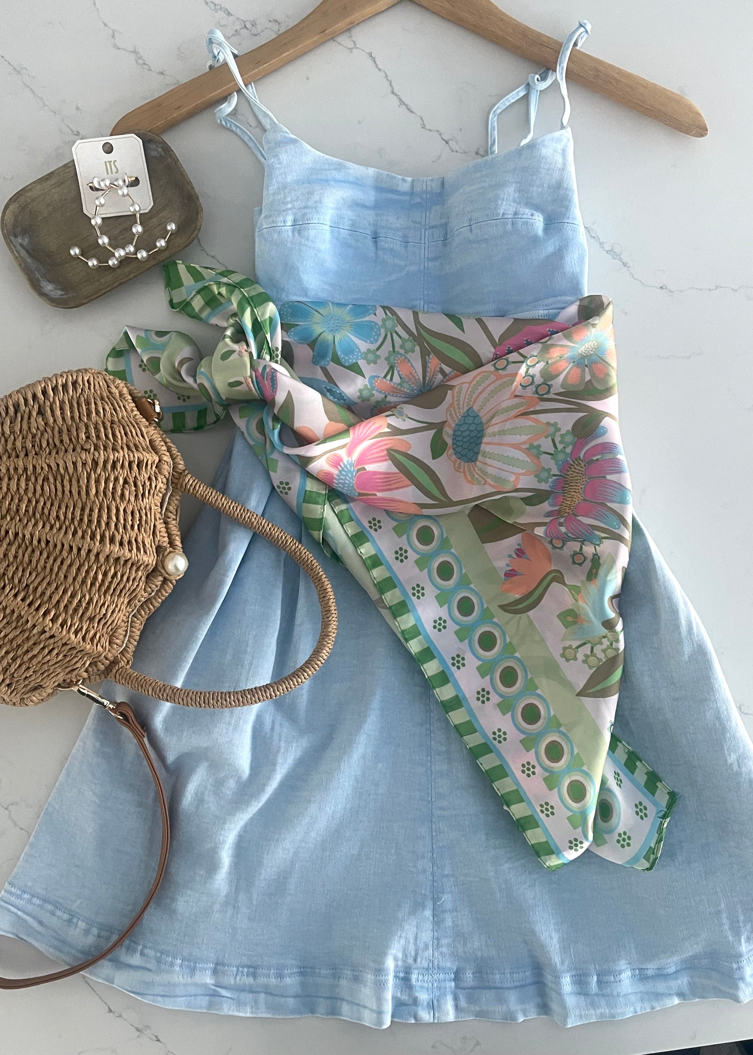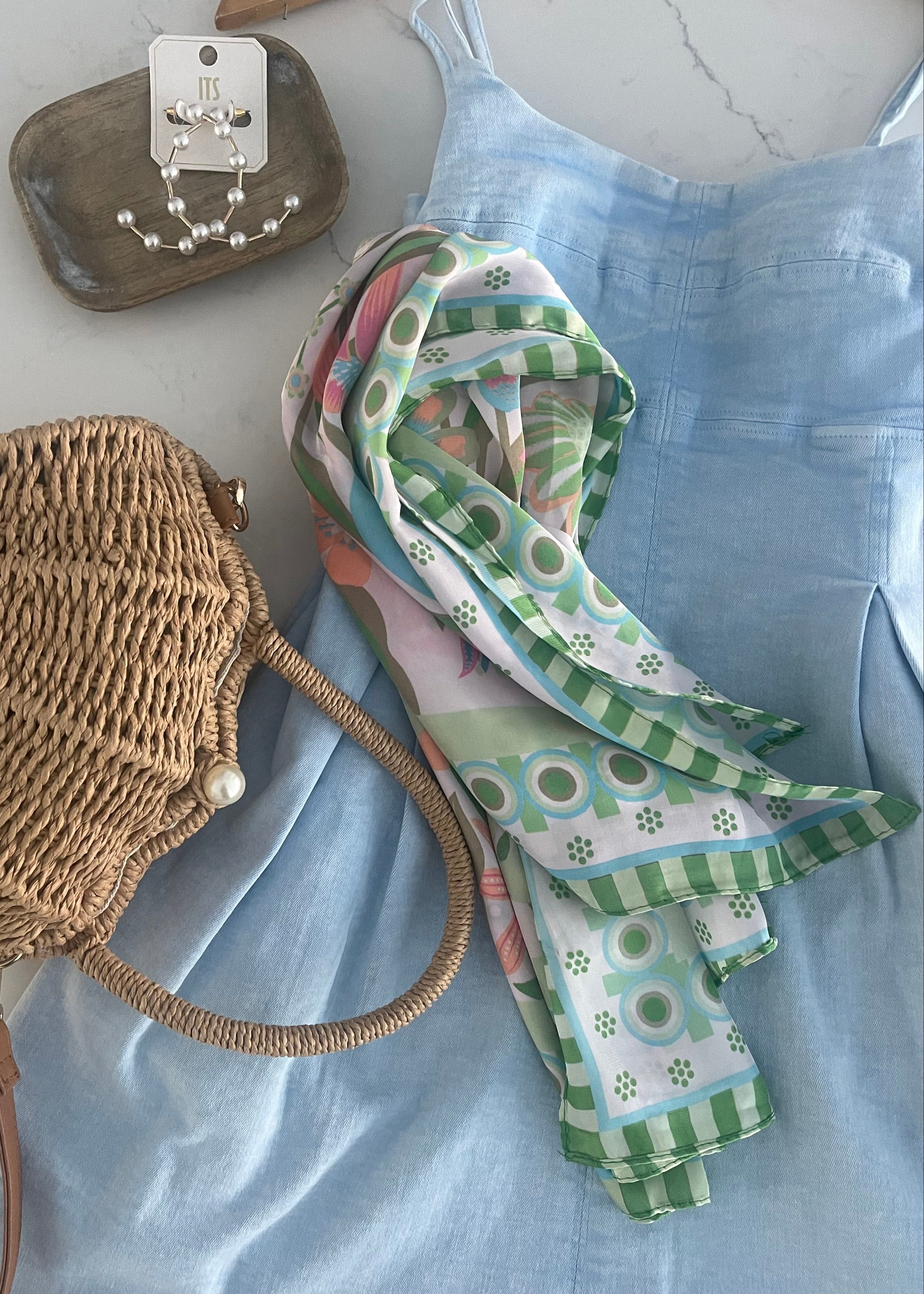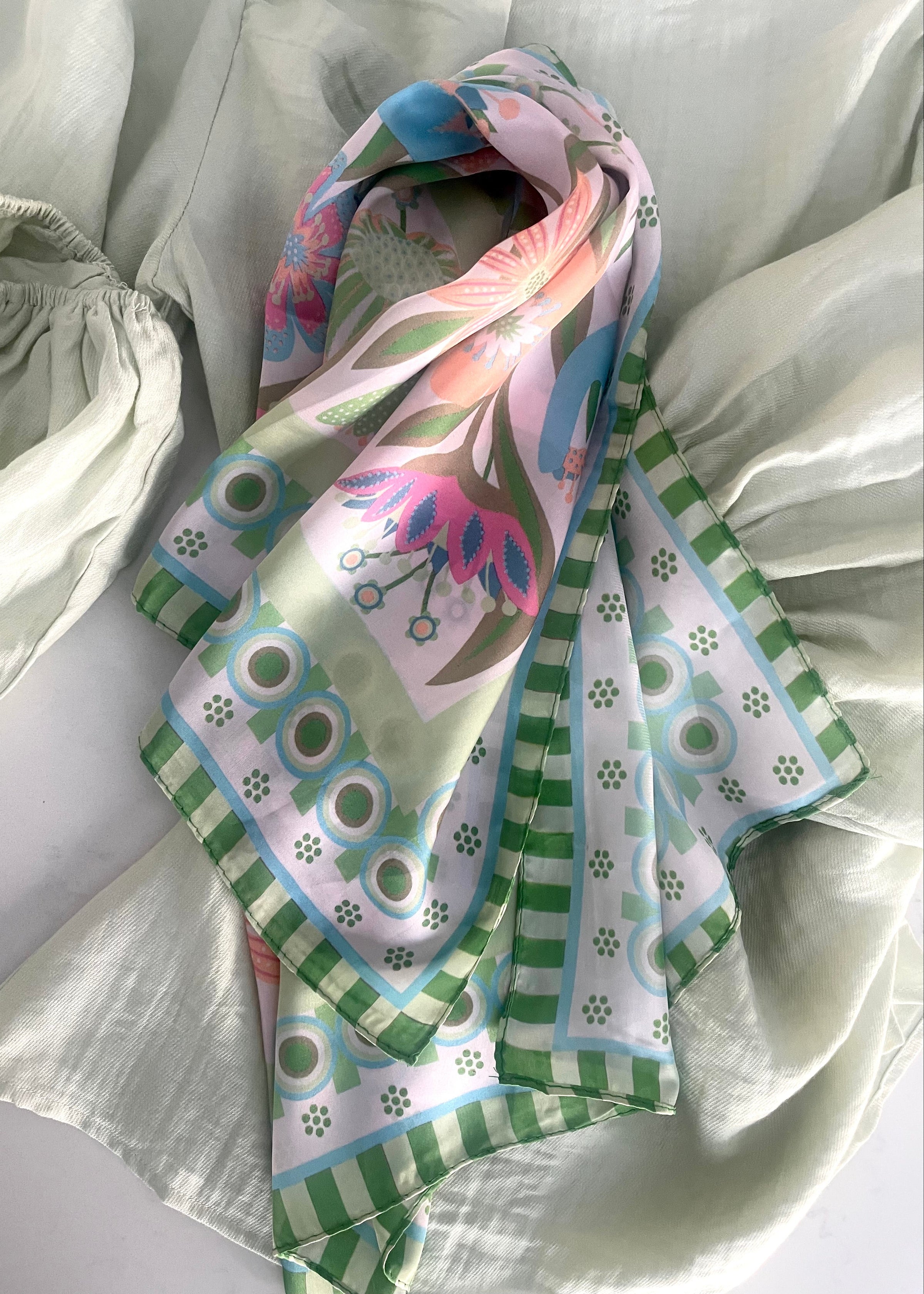* Retro Floral Print Bandana * SIZE : 27.5"X27.5". This Retro Floral Print features a lively arrangement of whimsical, vintage-inspired blooms and foliage, framed by a playful geometric border, and made with a soft, lightweight fabric. It can be tied around the neck to add a cheerful, nostalgic touch to a graphic tee and denim skirt for a retro-themed picnic, or worn as a headband to keep hair in place during a day at the farmers' market. Its compact, portable design also makes it easy to tuck into a bag, ready to elevate any outfit with a fresh, retro charm.