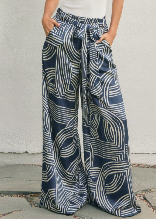 Printed satin wide leg pants. Elastic waist with belt loop - Removable sash belt - Side pockets