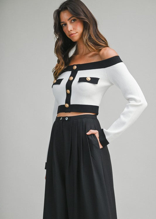 Off-shoulder knit cropped sweater top with contrast trim and gold button detail.